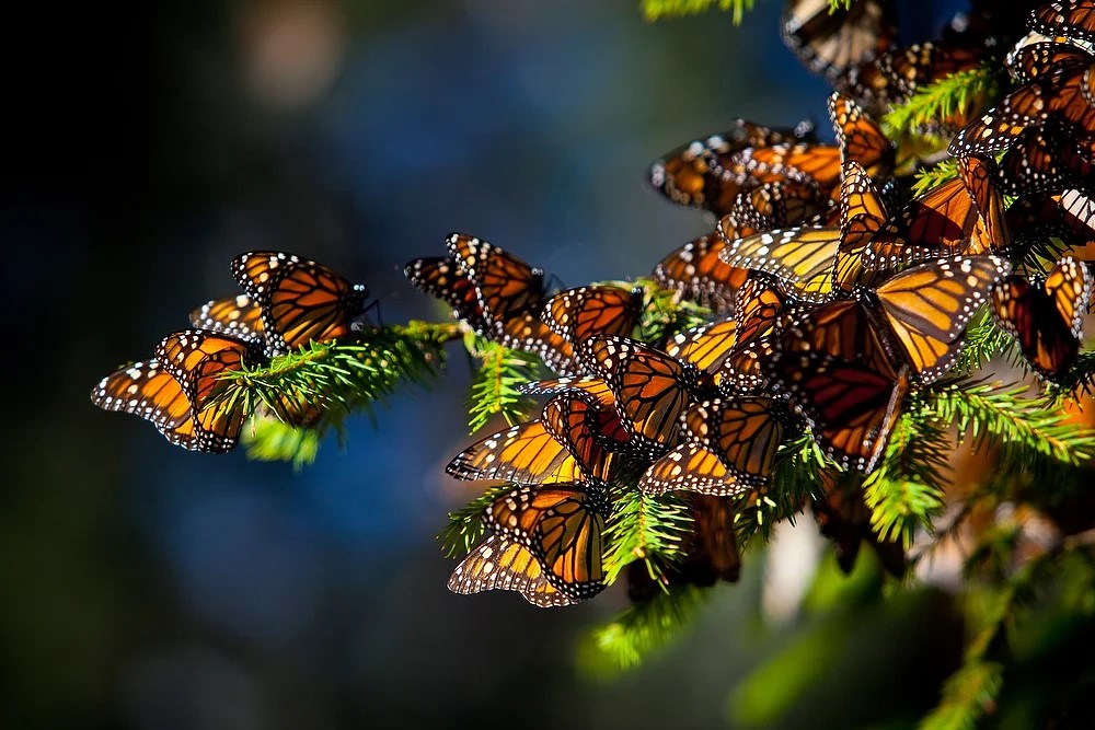 Millones de estas mariposas nacerán con el comienzo del invierno en los extensos bosques canadienses y comenzarán una nueva migración, esta vez hacia el Sur, que las llevará a cuatro mil quilómetros de distancia a unos bosques mexicanos del municipio de Michoacán, su santuario, en Zitácuaro, en Ocampo, en Angangueo. Las Mariposas Monarca que llegan a México tras su extenuante viaje nunca han estado aquí antes y, sin embargo, identifican los mismos árboles donde sus tatarabuelos hibernaron. Cada una de las mariposas longevas que ha viajado desde Canadá a los bosques de México dormirá durante todo el invierno, arracimada junto a miles de otras Mariposas Monarca, agarrada a un árbol de oyamel, el Abies religiosa, un abeto que las Monarca utilizarán generación tras generación.