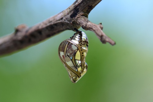 [La hermosa, sorprendente y amenazante crisálida «metálica» de la mariposa de frente negra (la tigerwing; Tithorea harmonia)]