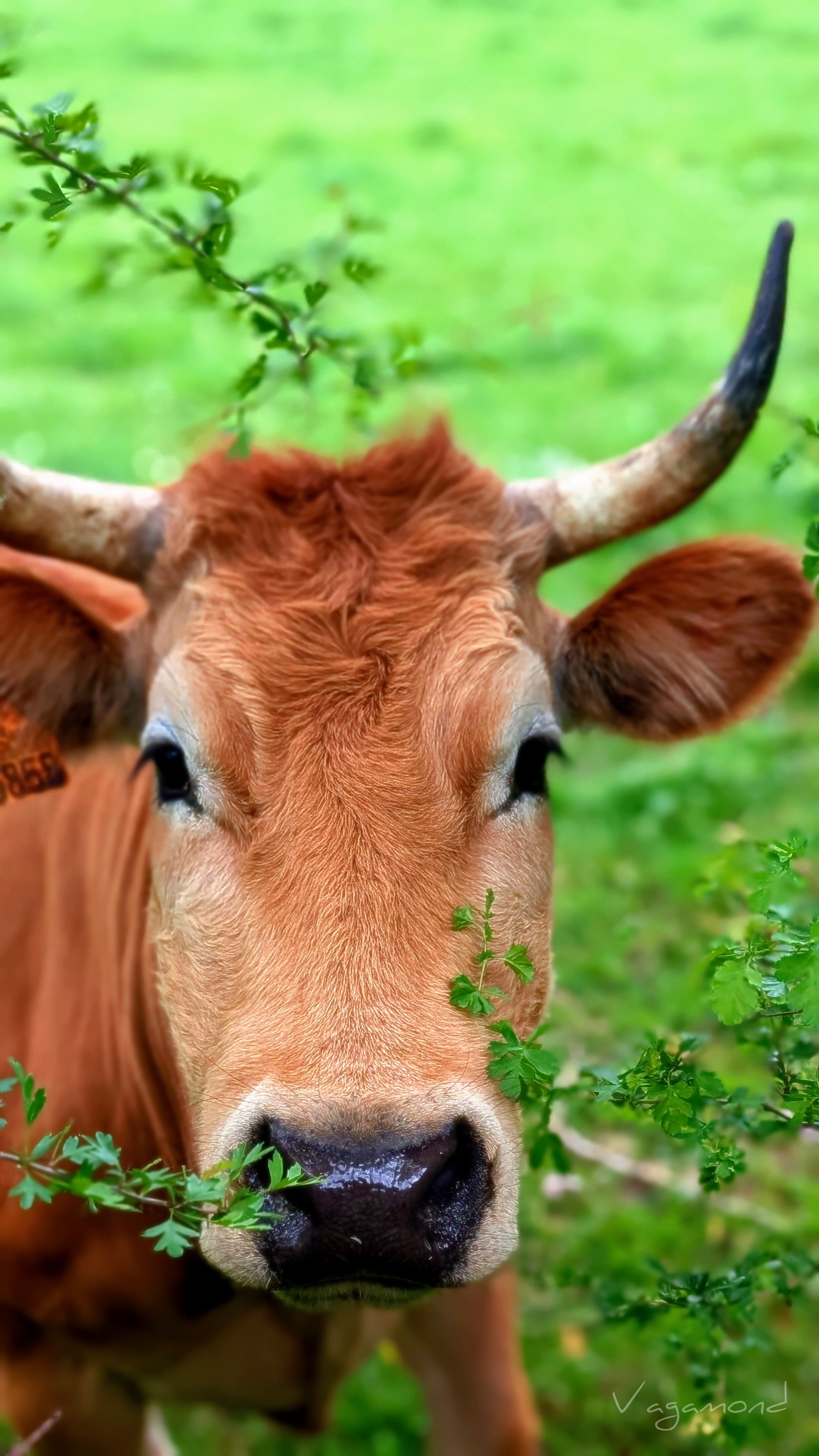 Vaca acariciada por las hojas de un espino blanco. Teverga, abril de 2026 Edición de color y contraste con Pixlr. No IA. Fotografía con Pixel 9 -modo retrato (close caption). © Vagamond